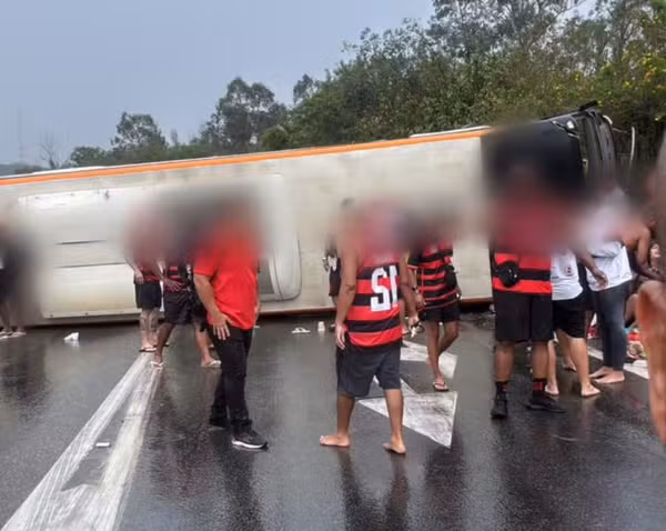 Ônibus com torcedores do Flamengo tomba na Dutra e deixa 16 feridos